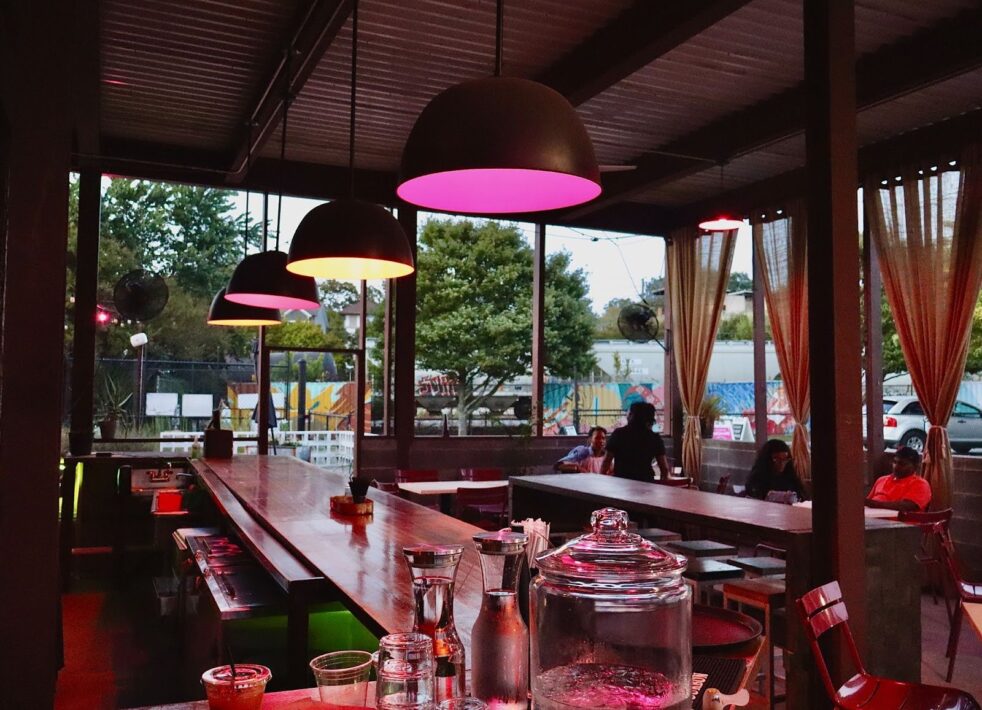 The dining room spills out into a colorfully lit patio bar and outdoor terrace. The open layout concept invites guests to wander and mingle.